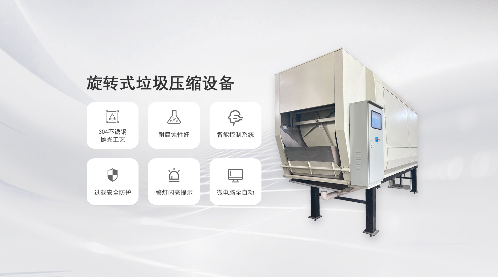 工作原理:滾筒螺旋葉片旋轉(zhuǎn)壓縮儲(chǔ)存。滾筒和葉片采用SUS304不銹鋼板制造,耐腐蝕性好。當(dāng)垃圾進(jìn)入滾筒內(nèi),滾筒旋轉(zhuǎn),在螺旋葉片作用下壓縮垃圾...