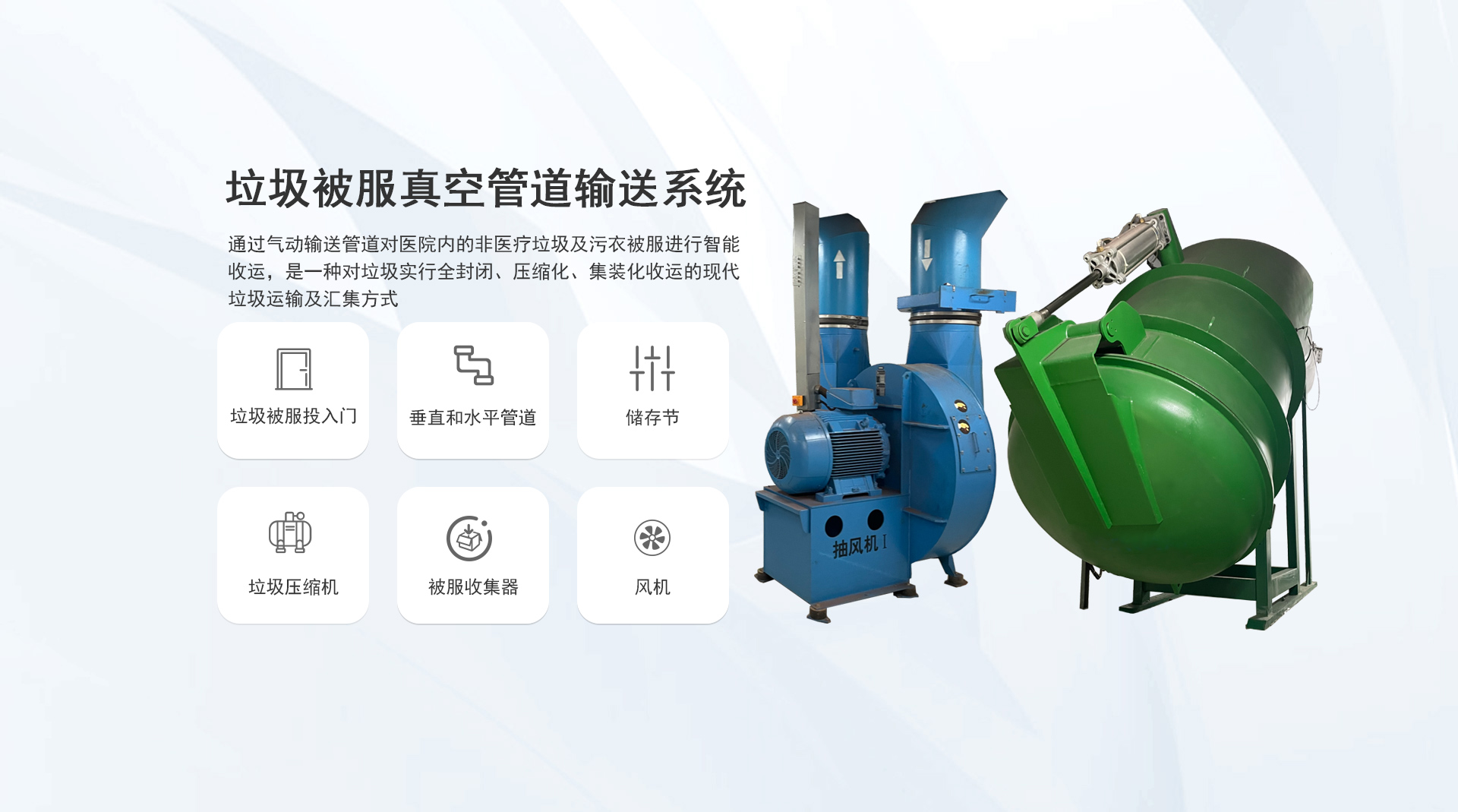 系統(tǒng)簡(jiǎn)介:通過氣力式輸送管道對(duì)醫(yī)院內(nèi)的垃圾和污衣被服進(jìn)行收集,是一種對(duì)垃圾實(shí)行全封閉、壓縮化、集裝化收運(yùn)的現(xiàn)代垃圾運(yùn)輸及匯集方式...